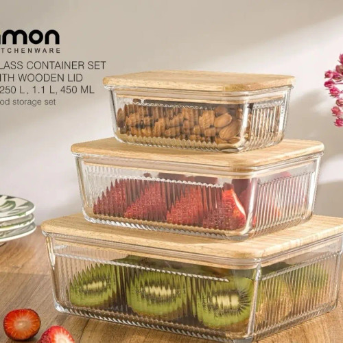 ست ظرف شیشه ای مستطیل شیار دار درب چوب لیمون(۲۲۱۱)